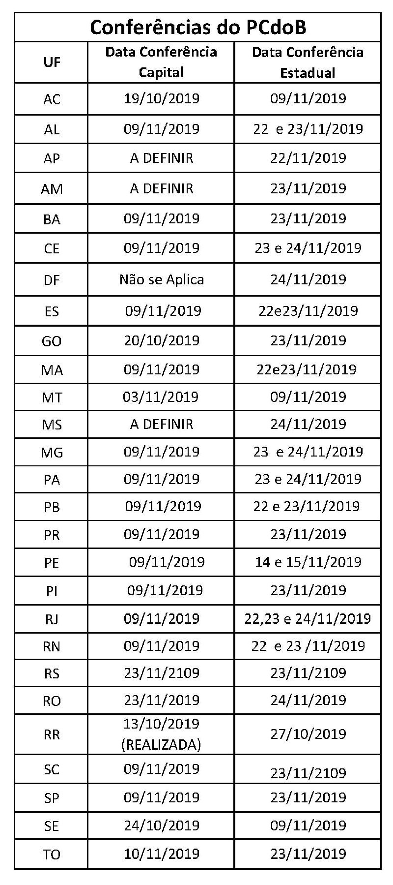Estão em marcha as conferências estaduais, municipais e de bases do PCdoB em todo o país. O calendário para as etapas nas capitais e nos estados está quase completo: todas devem ser realizadas até 24 de novembro deste ano.