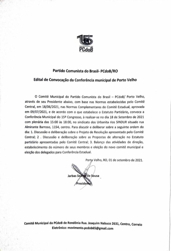 O Comitê Municipal do Partido Comunista do Brasil- PCdoB/Porto velho, através de seu presidente abaixo, com base nas normas estabelecidas pelo Comitê Central, em 18/06/2021, nas Normas Complementares do Comitê Estadual, aprovada em 09/072021, e de acordo com o que estabelece o Estatuto Partidário, Convoca a Conferência Municipal do 15° Congresso, à realizar- se no dia 18 de Setembro de 2021. Com plenária das 15:00 às 18:00, no sindicato dos Urbanitarios SINDUR situado na rua Almirante Barroso, 1154, centro.