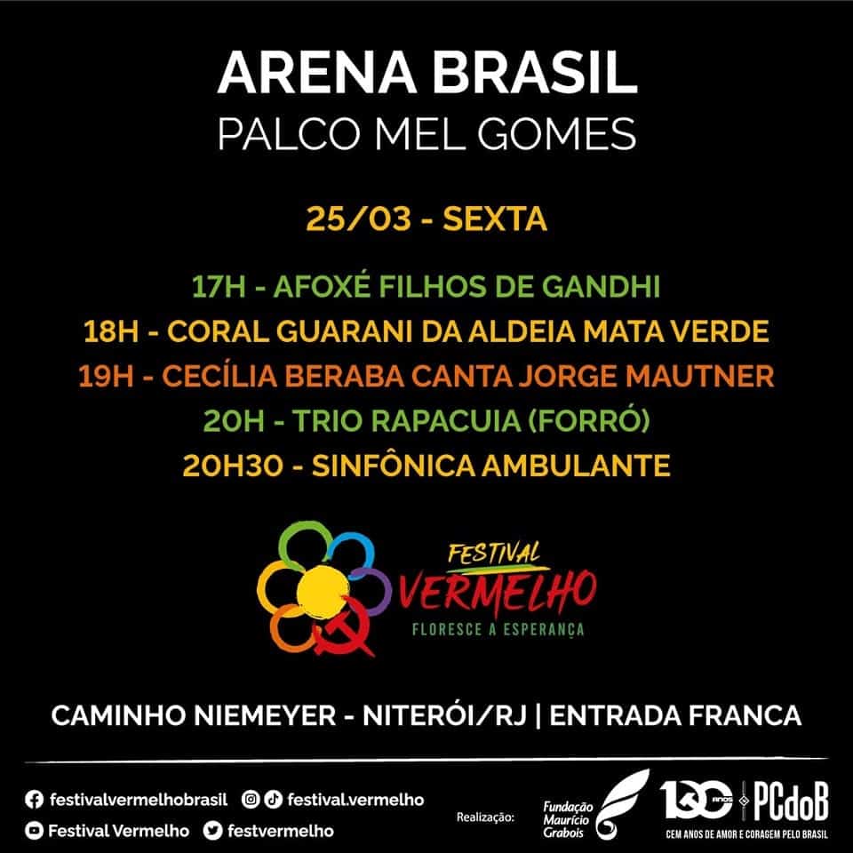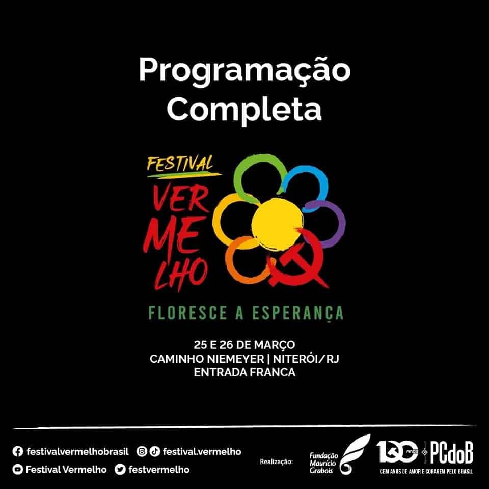 O Festival Vermelho acontecerá nesta sexta e sábado, 25 e 26 de março, com abertura dos portões às 15h de sexta. Será sediado no Teatro Popular Oscar Niemeyer, outra pessoa influente nos rumos políticos do Brasil e que também era filiado ao PCdoB. Assim, o PCdoB volta para casa para comemorar os 100 anos de sua existência.
