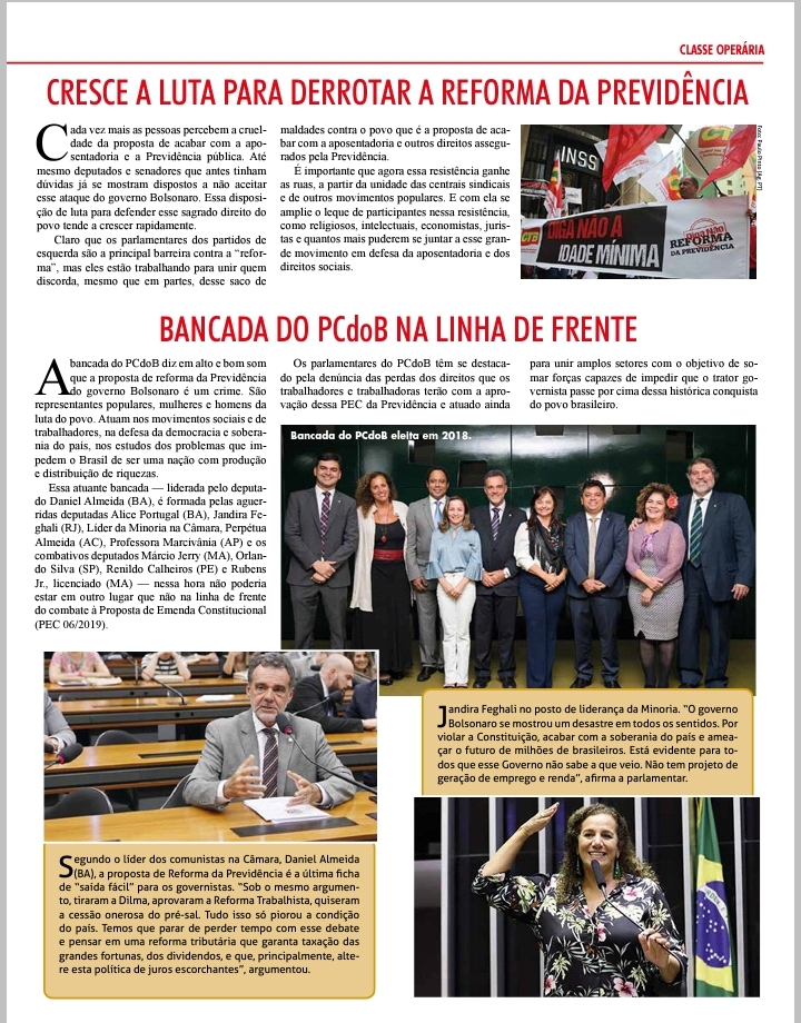 O jornal assinala a resistência dos comunistas no parlamento, na atuação destacada de suas lideranças e dos representantes do Partido nas entidades sociais e sindicais para defender a aposentadoria, direito de todos e todas.