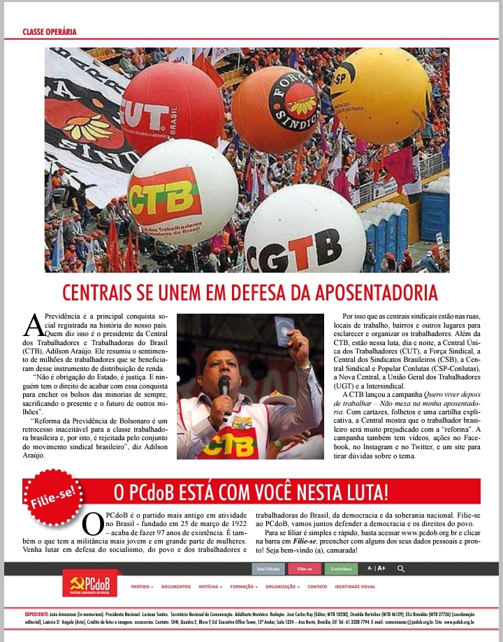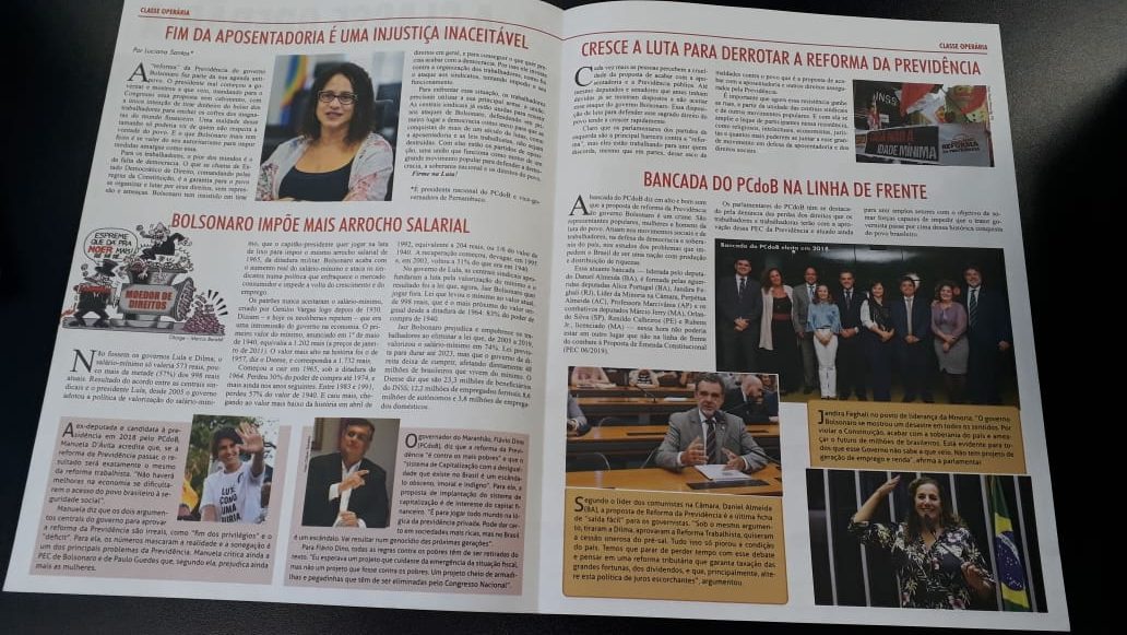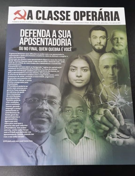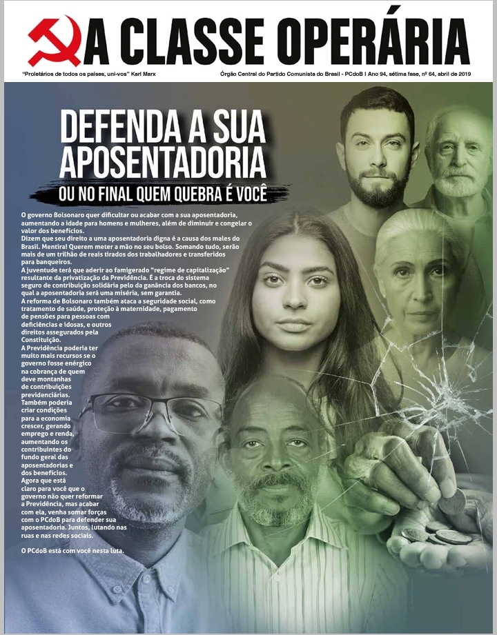 A Classe Operária – especial – aborda em seu editorial de capa os malefícios da proposta de reforma da Previdência do governo Bolsonaro. O texto critica a fixação de uma idade mínima para se aposentar, além do aumento da idade para homens e mulheres. Para os comunistas, “a Previdência poderia ter muito mais recursos se o governo fosse enérgico na cobrança de quem deve montanhas de contribuições previdenciárias. Também poderia criar condições para a economia crescer, gerando emprego e renda, aumentando os contribuintes do fundo geral das aposentadorias e dos benefícios”, aponta o tabloide.