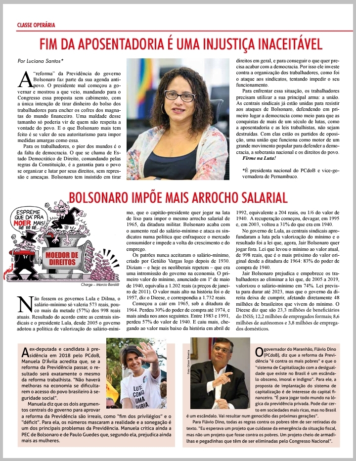 A Classe traz ainda a orientação da presidenta do PCdoB, Luciana Santos. Segundo ela, a “reforma” da Previdência do governo Bolsonaro faz parte da sua agenda antipovo e o “fim da aposentadoria é uma injustiça inaceitável”.