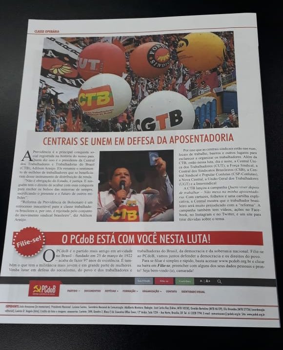 O jornal assinala a resistência dos comunistas no parlamento, na atuação destacada de suas lideranças e dos representantes do Partido nas entidades sociais e sindicais para defender a aposentadoria, direito de todos e todas.