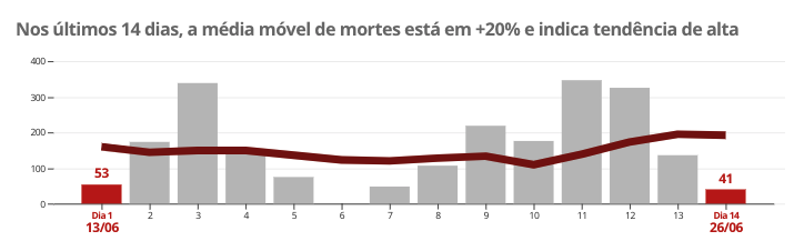 Chegamos a um patamar de menos de cem mortes diárias, há algumas semanas, mas voltamos a uma aceleração. Desde o dia 22 (média de 124 mortes diárias), a espiral de letalidade foi crescente, chegando a média de 194 mortes diárias nos últimos três dias. Considerando que em 17 de abril ao início de junho registravam-se menos de cem mortes diárias, o aumento foi de cerca de 100%, conforme observa o sanitarista.