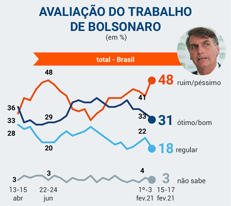 Bolsonaro sofre os efeitos do término definitivo do auxílio emergencial (agora sentido por todos que recebiam) e as indefinições a respeito da prorrogação. Até o fim de janeiro, o governo insistia na interrupção. Agora, já fala que o benefício voltará em março, mas não há projeto avançado a respeito. Além disso, diversas cidades anunciaram a suspensão da imunização contra a Covid-19 por falta de doses, em mais uma evidência da incompetência e da negligência do bolsonarismo frente à pandemia.