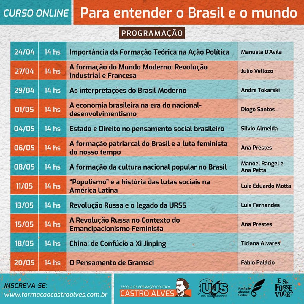 Em tempos de isolamento social para conter o espalhamento do novo coronavírus, multiplicam-se nas redes transmissões ao vivo e cursos dos mais variados tipos. A União da Juventude Socialista (UJS), com o Instituto E se Fosse Você e a Fundação Mauricio Grabois, fazem parte desta onda, mas com objetivo claro: ensejam trazer debates da atualidade essenciais para a formação política da juventude – e, quem sabe, contribuir com um mundo diferente para depois da pandemia.