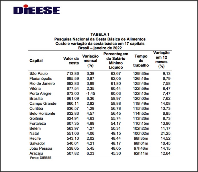 Em janeiro, o preço da cesta básica aumentou em 16 das 17 capitais onde o Dieese (Departamento Intersindical de Estatística e Estudos Socioeconômicos) realiza mensalmente a Pesquisa Nacional da Cesta Básica de Alimentos. A cesta mais cara foi encontrada em São Paulo, R$ 713,86, uma alta de 3,38%, na comparação com dezembro de 2021. Em 12 meses, o percentual de aumento foi de 9,13%. O menores valores médios foram observados em Aracaju (R$ 507,82), João Pessoa (R$ 538,65) e Salvador (R$ 540,01).