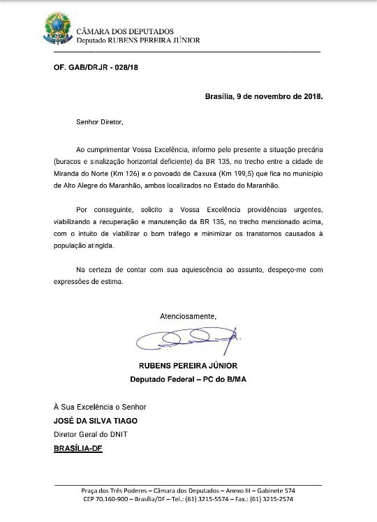 O vice-líder do PCdoB na Câmara dos Deputados, Rubens Pereira Jr (MA) enviou ofício ao Departamento Nacional de Infraestrutura e Transporte (DNIT), solicitando providências urgentes, viabilizando a recuperação e manutenção da BR 135, no trecho entre a cidade de Miranda do Norte (Km 126) e o povoado de Caxuxa (Km 199,5) que fica no município de Alto Alegre do Maranhão, ambos localizados no Estado do Maranhão.