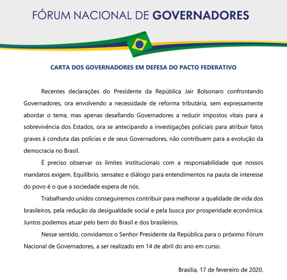No documento, aproveitaram para convidar Bolsonaro a participar da próxima reunião do fórum, que será realizada em 14 de abril.
