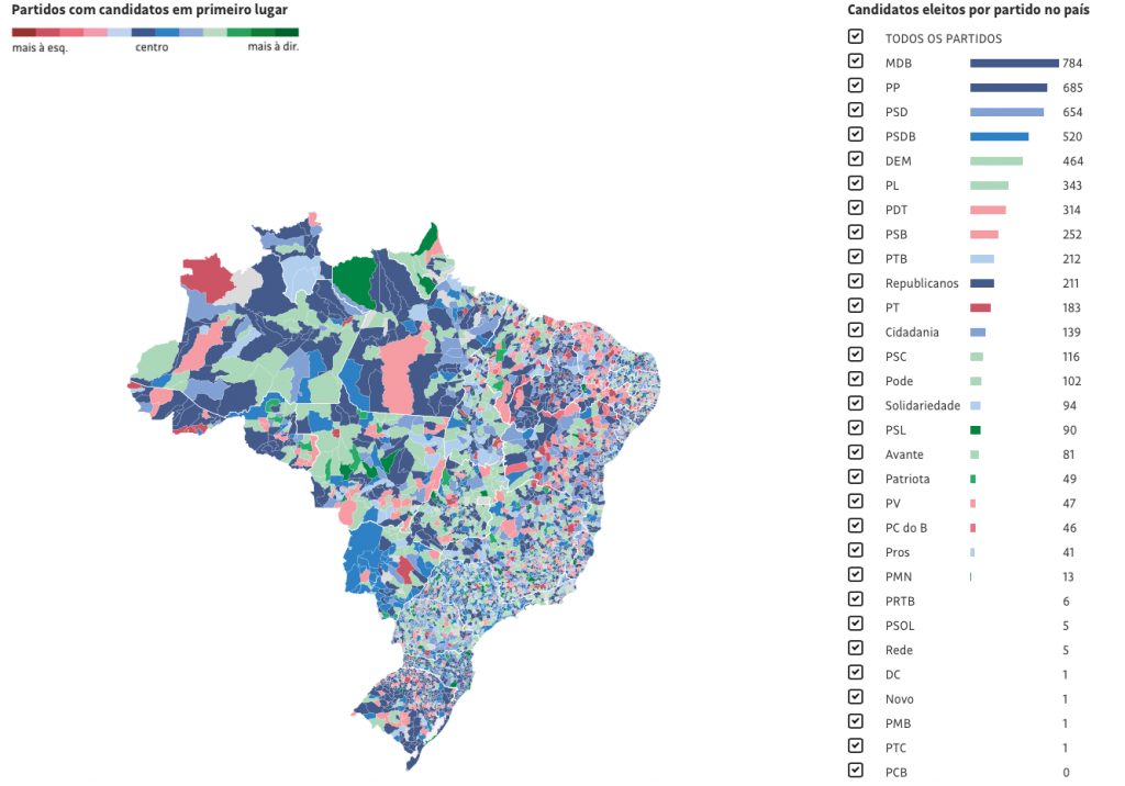 Após o segundo turno das eleições municipais de 2020, um balanço geral confirma uma “alavancada” dos partidos que fazem parte do Centrão. Entre eles, estão o PP, que foi o 2º partido com maior número de prefeituras no Brasil, e o PSD, em 3º lugar. Com mais prefeituras ficou o MDB, mas com certo encolhimento em relação a 2016. O PT também teve uma queda, sem nenhum representante em capitais, pela primeira vez, desde a redemocratização.
