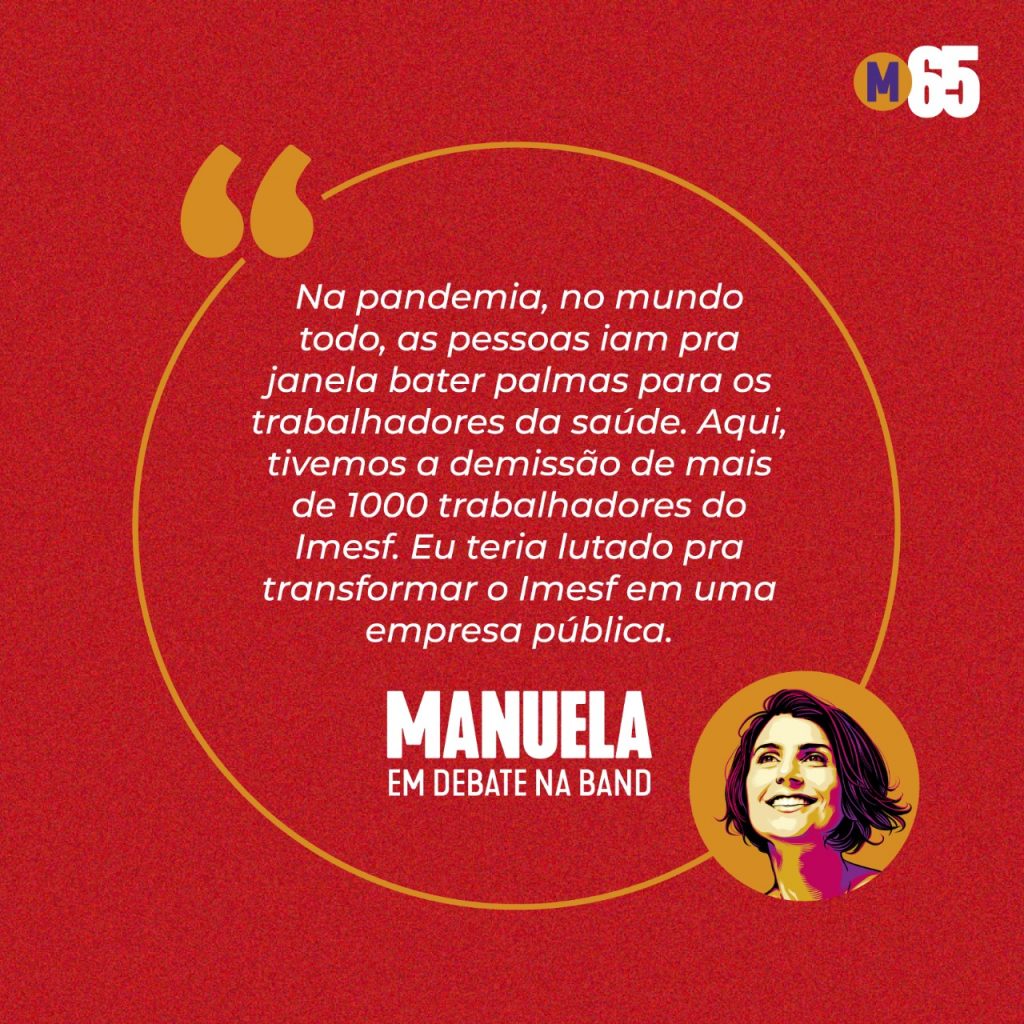 Ainda sobre o Instituto, Manuela destacou: “Na pandemia, nós tivemos a demissão de mais de 1.200 trabalhadoras e trabalhadores do Imesf. No mundo inteiro, o povo ia para a janela bater palmas para os profissionais da saúde e aqui, o prefeito cortou o vale-alimentação dessas mulheres e homens que estão salvando a vida dos porto-alegrenses. Eu teria lutado para transformar o Imesf numa empresa pública e garantir a continuidade, a territorialidade e a gestão pública da saúde pública de nossa cidade”.