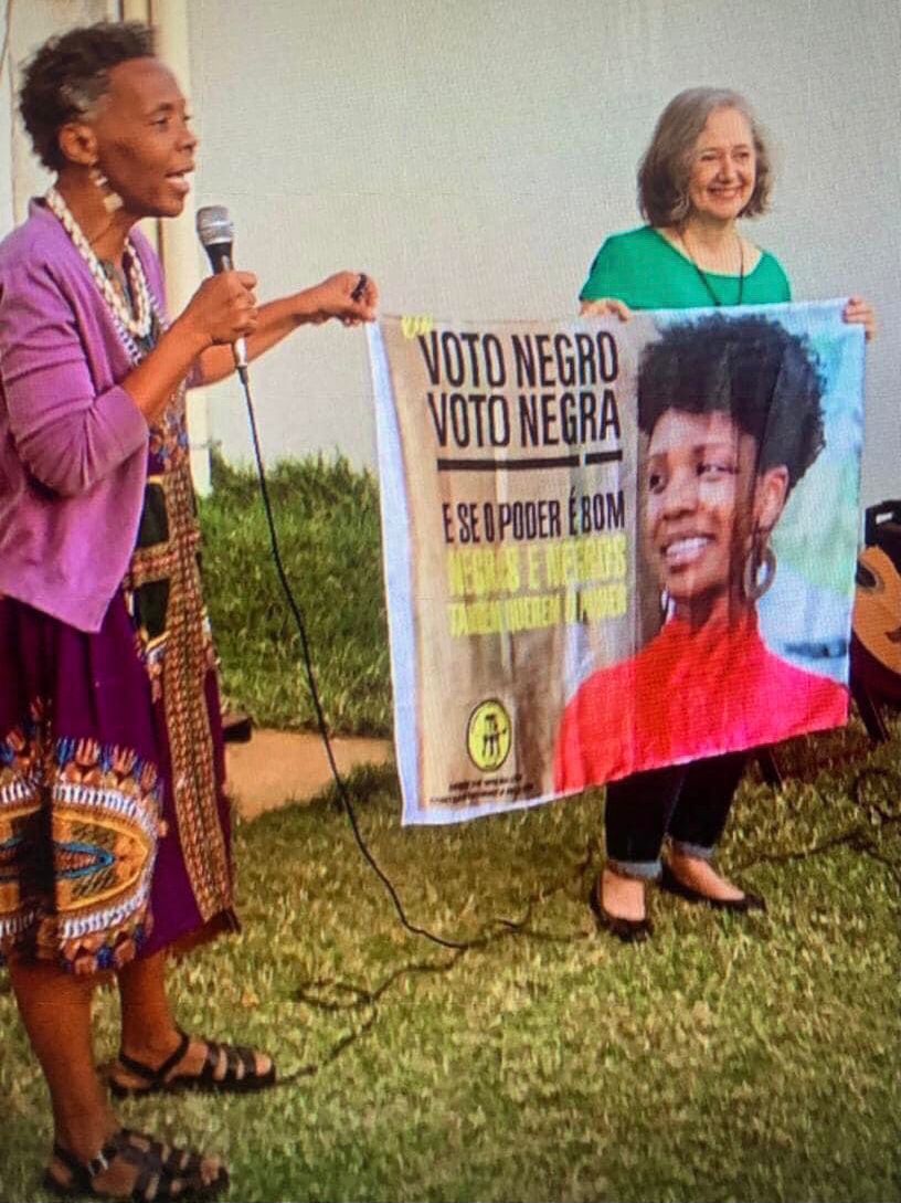 Concluiu sua fala convidando Denise para estenderem juntas duas lindas bandeiras símbolos de muita esperança. Uma delas com os dizeres “Se o poder é bom, negras e negros querem o poder”, encorajando a luta pela transformação do país em uma democracia para todos e todas.