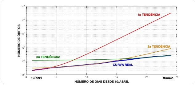 A afirmação desta segunda-feira é baseada em gráfico feito pelo Prof. Dr. Allan Kardec, da UFMA, que mostra como, apesar de ainda alto, o número de casos de óbitos por covid-19 está menor do que as tendências indicavam anteriormente.