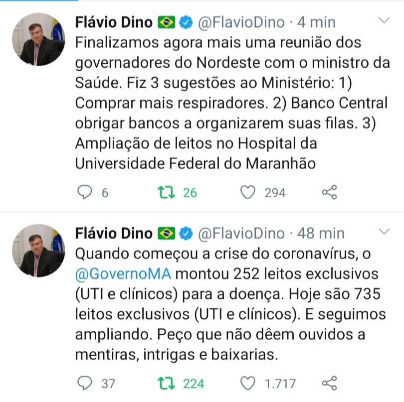 “Finalizamos agora mais uma reunião dos governadores do Nordeste com o ministro da Saúde. Fiz três sugestões ao Ministério: 1) Comprar mais respiradores; 2) Banco Central obrigar bancos a organizarem suas filas e 3) Ampliação de leitos no Hospital da Universidade Federal do Maranhão”, destacou o governador, em um tuíte.