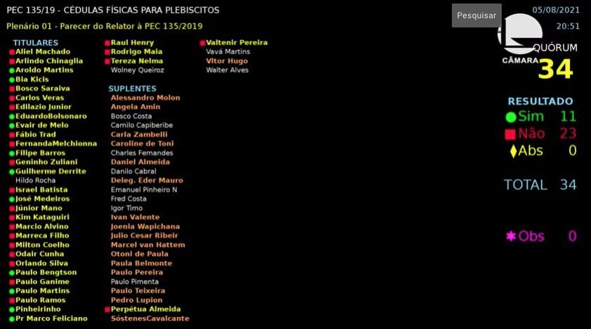 Por 23 votos a 11, parlamentares rejeitaram, nesta quinta-feira (5), o voto impresso (PEC 135/19) na comissão especial que analisa o tema na Câmara. Com o resultado, um novo parecer com a indicação vencedora será elaborado pelo deputado federal Júnior Mano (PL-CE), conforme determinação do presidente do colegiado, deputado federal Paulo Eduardo Martins (PSC-PR), e votado na sexta-feira (6), às 18h.