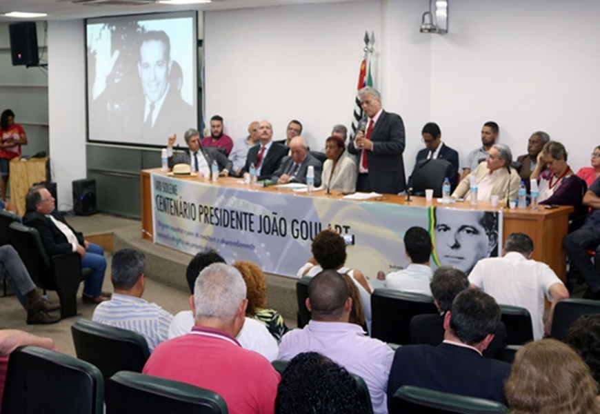 O Hino Nacional brasileiro abriu, na noite de segunda-feira (16), a solenidade em homenagem ao centenário de nascimento do ex-presidente João Goulart, realizada no auditório Paulo Kobayashi da Assembleia Legislativa de São Paulo (Alesp), por iniciativa da deputada estadual Leci Brandão (PCdoB-SP).