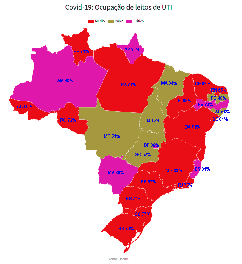 A ocupação dos leitos de UTI (Unidade de Tratamento Intensivo) nos hospitais de todo o país está em seu nível mais alto desde julho do ano passado. De acordo com balanço feito pelo Observatório Covid-19 ligado à Fiocruz (Fundação Oswaldo Cruz): 21 estados mais a cidade do Rio de Janeiro têm hoje níveis médios ou críticos de ocupação.