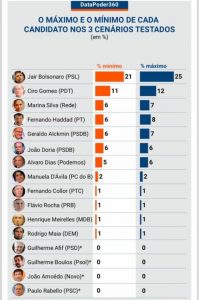 Sem o ex-presidente Lula, o deputado federal (PSL-RJ) Jair Bolsonaro aparece em primeiro lugar, com 21%, seguido do ex-ministro Ciro Gomes (PDT), com 11%. A ex-senadora Marina Silva (Rede), aparece em terceiro lugar, com 7%. O ex-prefeito de São Paulo, Fernando Haddad (PT) e o ex-governador de São Paulo, Geraldo Alckmin (PSDB) estão empatados, com 6%. O senador Alvaro Dias (Podemos), pontua 5%.