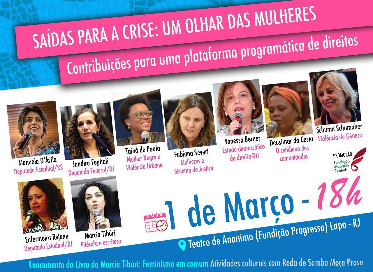 Com objetivo de contribuir para formulação de uma plataforma programática de direitos sociais e de gênero, lideranças feministas se reúnem para encontrar saídas para a crise com a participação de Manuela D’Ávila no debate um olhar das mulheres. O evento acontece no Rio, nesta quinta-feira (1º), às 18 horas, no Teatro de Anonimo, no bairro da Lapa. O seminário é promovido pela Fundação Maurício Grabois. A participação no evento pode ser confirmada através do evento no Facebook: link.