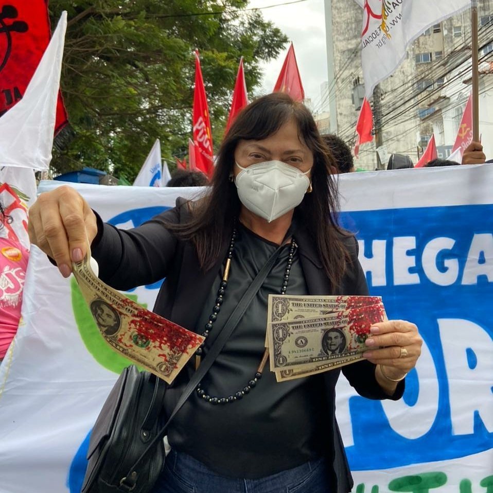Alice Portugal postou imagem nas redes sociais com os dizeres: “Estamos nas ruas, unidos, mas distanciados! Juntando forças, nos protegendo e construindo um futuro melhor para o país! A nossa luta é por democracia, ciência, vacina no braço e comida no prato!”, publicou.