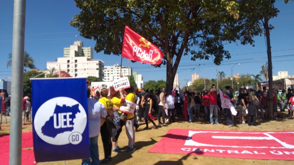 16 cidades goianas marcaram atos ao longo do dia nacional de luta neste sábado (3). Na capital, Goiânia, a concentração começou cedo, na Praça Cívica. Os manifestantes saíram em passeata pelas ruas do centro da cidade, pedindo pelo impeachment de Bolsonaro. A dispersão ocorreu por volta de 12 horas, na Praça do Trabalhador: