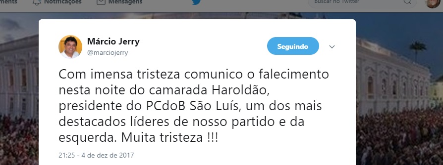 Ainda nesta segunda-feira, o presidente estadual do PCdoB-Maranhão comunicou a morte de “um dos mais destacados líderes” e escreveu: “muita tristeza”.