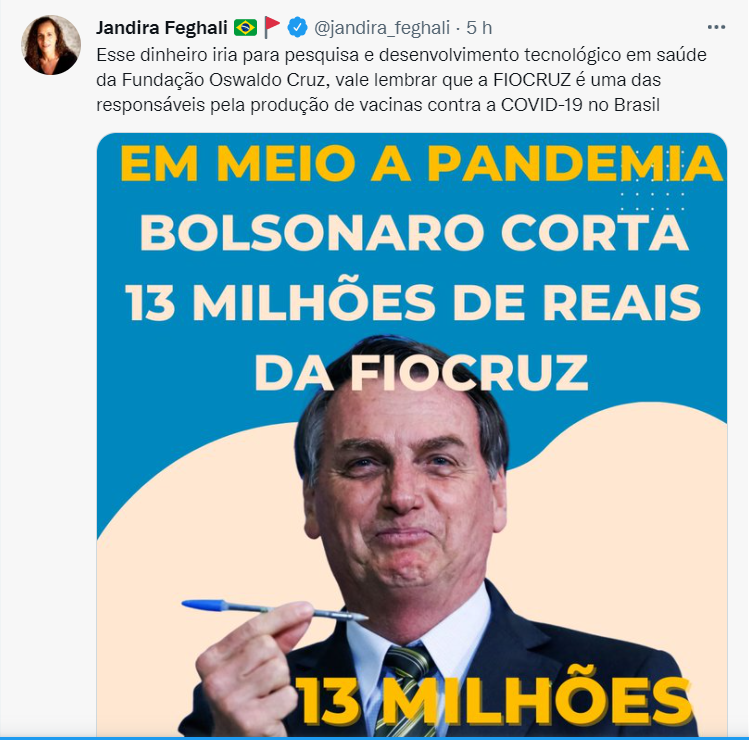 A deputada Jandira Feghali lamentou o corte de R$ 13 milhões realizado na verba da Fiocruz. “Esse dinheiro iria para a pesquisa e desenvolvimento tecnológico em saúde da Fundação Oswaldo Cruz, vale lembrar que a Fiocruz é uma das responsáveis pela produção de vacinas contra a Covid-19 no Brasil”, recordou.
