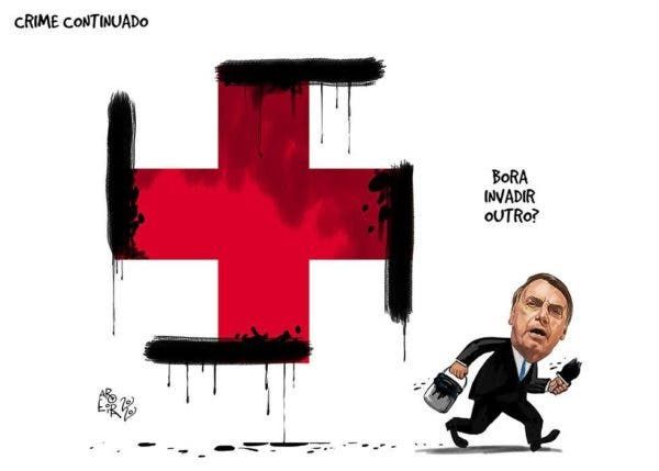 Na charge, Bolsonaro pinta a suástica numa cruz vermelha, enquanto incita a invasão de outro hospital, numa alusão direta às recentes falas de Jair Bolsonaro, em que o presidente pede a seus aliados que entrem nos hospitais com pacientes infectados pelo coronavírus para fazer gravações.