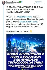 O filho de Jair Bolsonaro disse que o Brasil apoia projeto comandado pelos Estados Unidos e “se afasta” da tecnologia chinesa. “O governo Jair Bolsonaro declarou apoio à aliança Clean Network, lançada pelo governo de Donald Trump, criando uma aliança global para um 5G seguro, sem espionagem da China”, escreveu o deputado no Twitter para logo depois apagar sua publicação.
