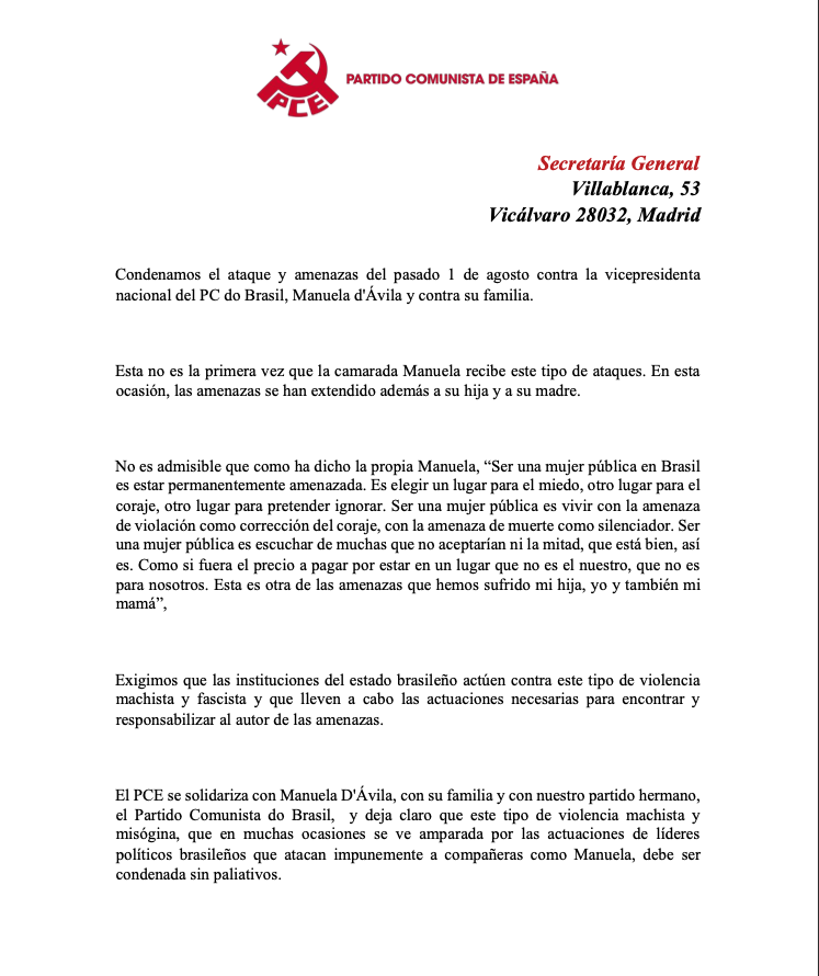 O Partido Comunista da Espanha (PCE) emitiu nota em que se solidariza com a vice-presidenta nacional do PCdoB, Manuela D’Ávila, e sua família.