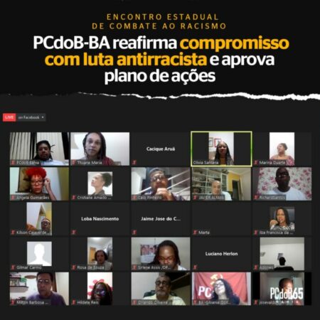 O Comitê Estadual do PCdoB na Bahia realizou, nesta terça-feira (25), Dia Mundial da África, o Encontro Estadual de Combate ao Racismo. Na ocasião, cerca de 100 pessoas, entre militantes da luta antirracista, aliados e dirigentes partidários, discutiram on-line as relações entre o capitalismo e o racismo no contexto da pandemia, e ainda construíram um plano de atuação nesta frente para o biênio 2021/2022.