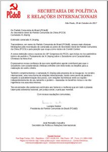 Transmitimos, em nome do Partido Comunista do Brasil (PCdoB), nossas mais efusivas felicitações pela recondução do camarada ao posto de Secretário-Geral do Partido Comunista da China (PCCh) e pela posição que ocupa como núcleo do Comitê Central.