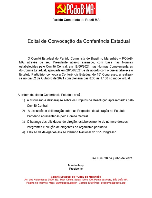 A direção estadual do Partido Comunista do Brasil (PCdoB) do Maranhão, convoca sua militância a participar da conferência estadual partidária que se realizará no dia 2 de outubro de 2021.