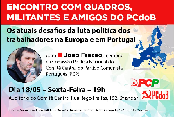 A secretaria de Relações Internacionais do PCdoB e a Fundação Maurício Grabois promovem uma palestra sobre “Os atuais desafios da luta política dos trabalhadores na Europa e em Portugal”, com o membro da Comissão Política Nacional do Comitê Central do Partido Português (PCP), João Frazão, na próxima sexta-feira (18), às 19 horas, em São Paulo.