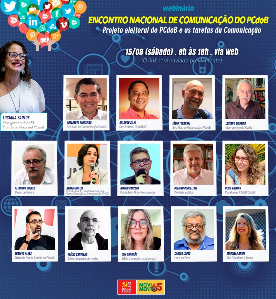 O webinário do Encontro de Comunicação, que terá início às 9h e se estenderá até às 18h, é dirigido aos secretários(as) de comunicação e dirigentes dos comitês estaduais e municipais do PCdoB; pré-candidatos(as) do partido e profissionais que atuam na comunicação do PCdoB.