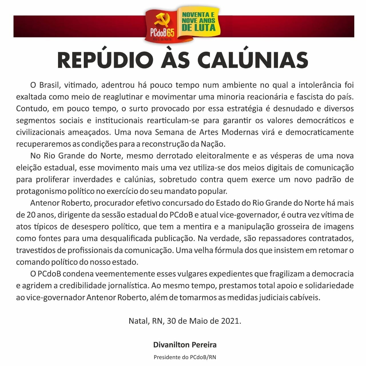 O Comitê Estadual do PCdoB do Rio Grande do Norte publicou uma nota de repúdio, no último dia 30 de maio em suas redes sociais, referente às fake news divulgadas contra o vice-governador e dirigente do partido no estado, Antenor Roberto.