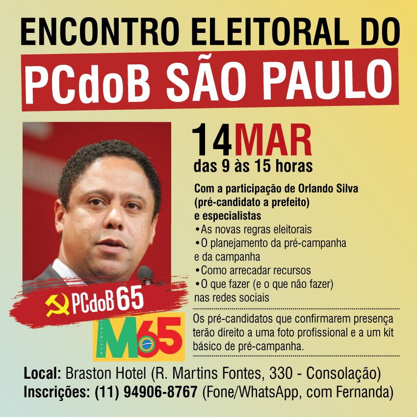 A preparação dos pré-candidatos comunistas às eleições 2020 terá um capítulo especial neste sábado (14), com a realização, das 9 às 15 horas, do Encontro Eleitoral do PCdoB São Paulo (SP). Convocado pelo Comitê Municipal do Partido, o evento terá a participação do deputado federal e pré-candidato a prefeito Orlando Silva (PCdoB-SP), bem como do coordenador de seu programa de governo, Ricardo Leyser.
