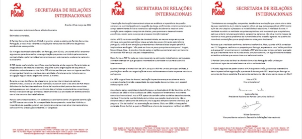 O Partido Comunista do Brasil, PCdoB, transmite, a todo o coletivo do Partido Comunista Português, a nossa mais vibrante saudação pelo transcurso dos 100 anos de gloriosa existência de vosso partido.