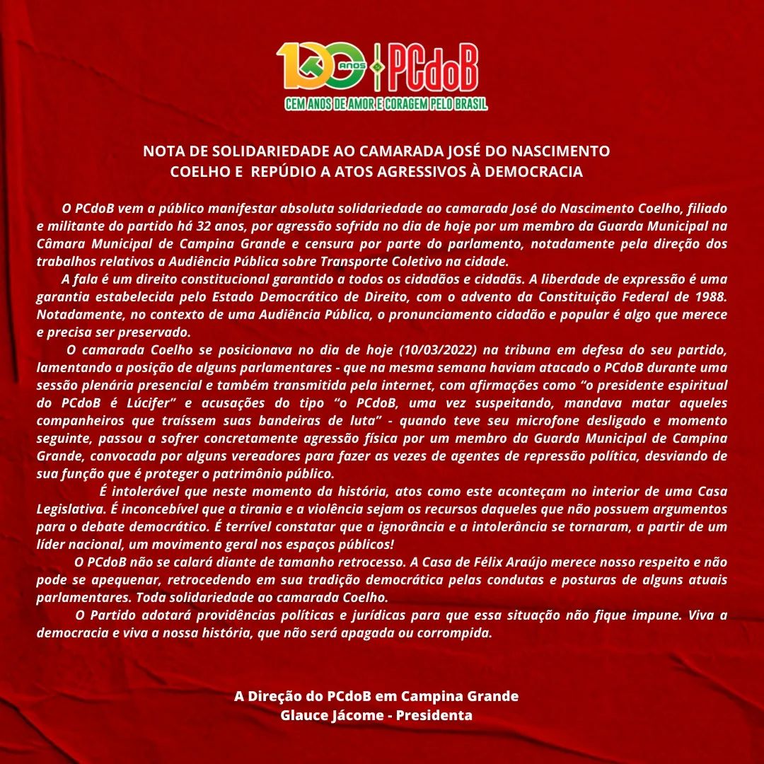 O camarada Coelho se posicionava no dia de hoje (10/03/2022) na tribuna em defesa do seu partido, lamentando a posição de alguns parlamentares – que na mesma semana haviam atacado o PCdoB durante uma sessão plenária presencial e também transmitida pela internet, com afirmações como “o presidente espiritual do PCdoB é Lúcifer” e acusações do tipo “o PCdoB, uma vez suspeitando, mandava matar aqueles companheiros que traíssem suas bandeiras de luta” – quando teve seu microfone desligado e momento seguinte, passou a sofrer concretamente agressão física por um membro da Guarda Municipal de Campina Grande, convocada por alguns vereadores para fazer as vezes de agentes de repressão política, desviando de sua função que é proteger o patrimônio público.