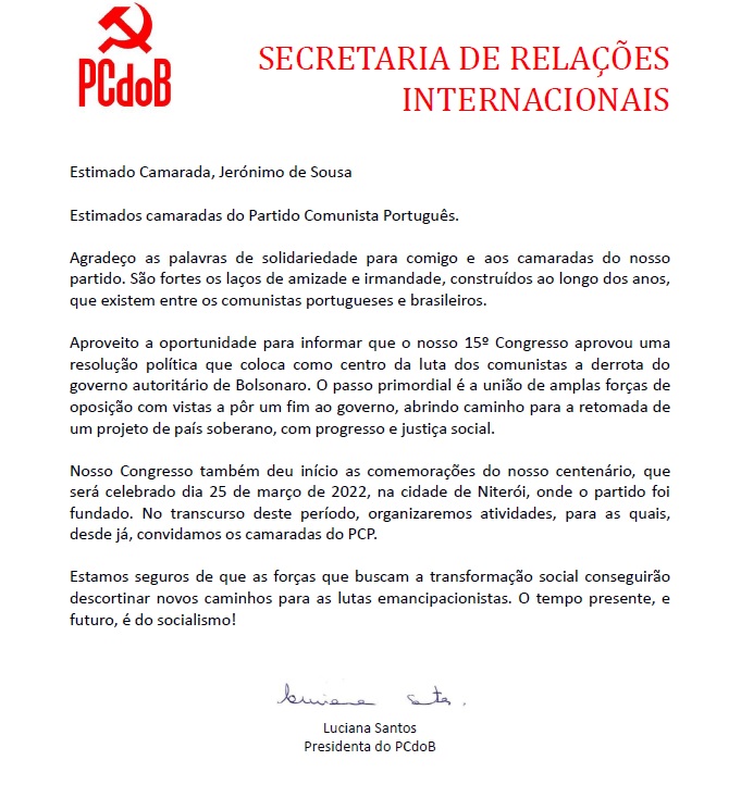 Jerónimo, em sua carta, reafirma “a amizade e a solidariedade do Partido Comunista Português para com o Partido Comunista do Brasil (…) no momento em que o PCdoB comemora seu centenário“.
