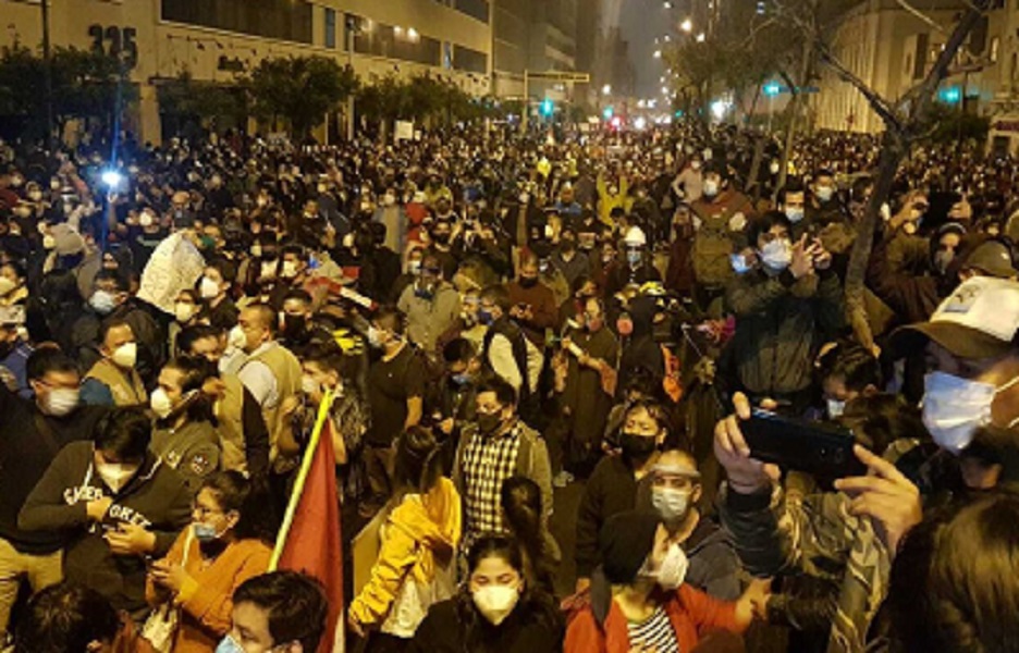 Sua posse deu lugar a uma onda de protestos, com a Praça San Martin, em frente ao parlamento, em Lima, completamente tomada por manifestantes que condenando a medida que denunciam como “armação” e exigindo respeito. Também houve protestos em Cuzco, Arequipa e Trujillo em defesa da democracia.