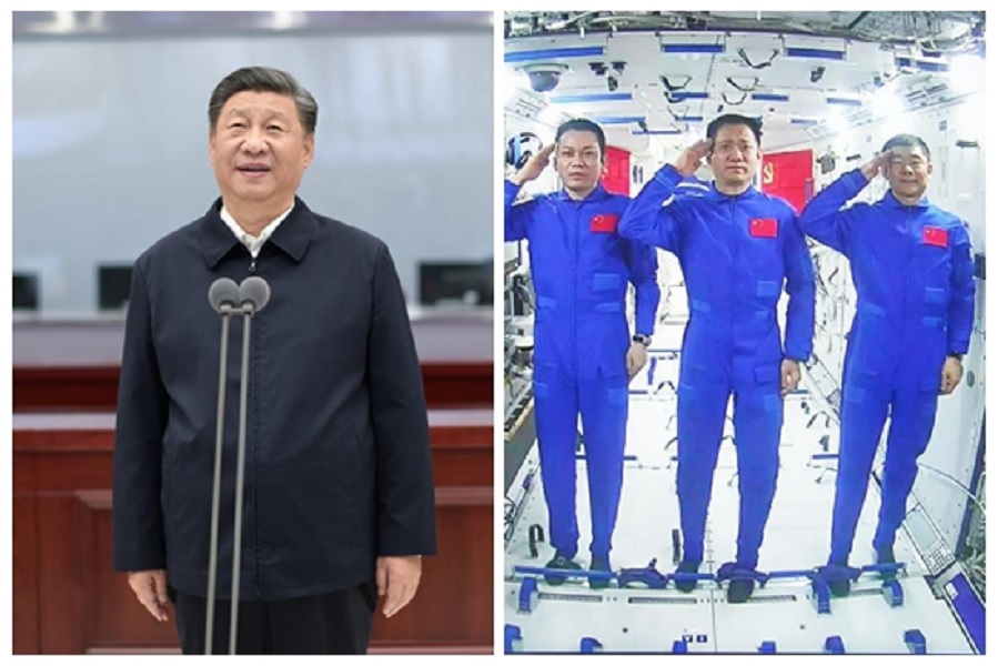 O presidente chinês, Xi Jinping, conversou, do Centro de Controle Aeroespacial de Pequim, na quarta-feira (23), com os astronautas Nie Haisheng, Liu Boming e Tang Hongbo, da espaçonave Shenzhou-12, que estão trabalhando no módulo espacial Tianhe.