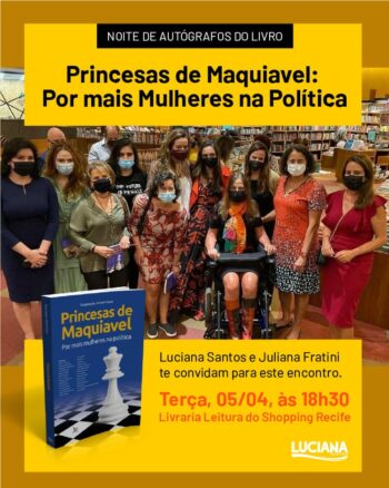 A vice-governadora de Pernambuco (PE) e presidenta nacional do PCdoB, Luciana Santos, participa nesta terça (5), da noite de autógrafos do livro Princesas de Maquiavel: Por mais mulheres na política. Ela é autora de um dos artigos que compõem a coletânea. A publicação é organizada pela cientista política Juliana Fratini, que estará presente no evento. A atividade acontece às 18h30, na Livraria Leitura, no Shopping Recife.
