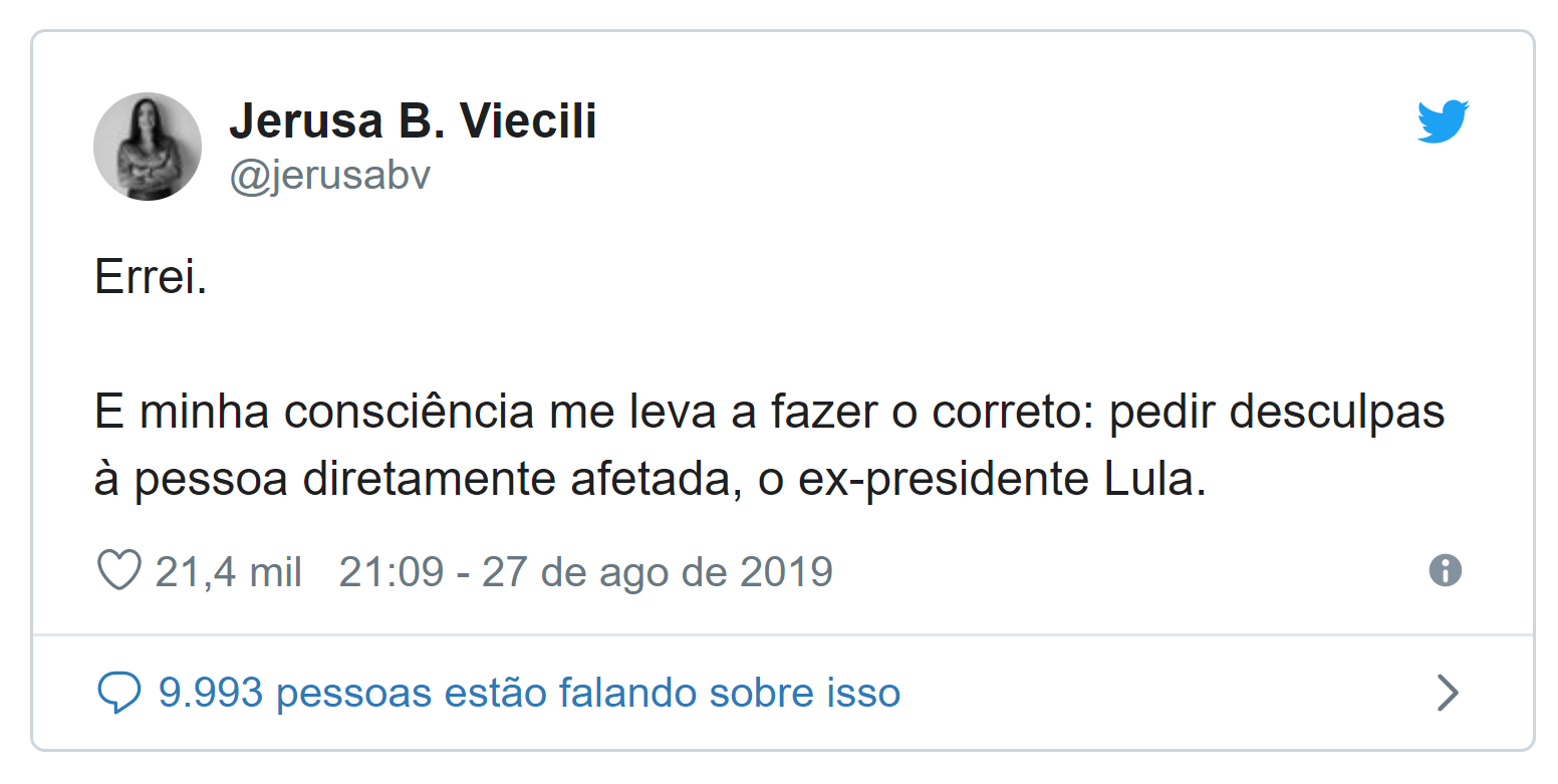 Pouco mais de uma hora depois de se desculpar, Jerusa sentiu a pressão e recuou. Em outro tuíte, ela escreveu que o reconhecimento da autenticidade de trecho publicado pelo UOL não significa que ela endosse todas as outras publicações em que é mencionada. “Lembrar de uma mensagem não autentica todo o conjunto. A existência de mensagens verdadeiras não afasta o fato de que as mensagens são fruto de crime e têm sido descontextualizadas ou deturpadas para fazer falsas acusações”, disse.