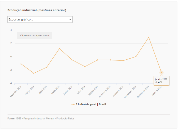 De acordo com o IBGE, entre as atividades, as influências negativas mais importantes na passagem de dezembro de 2021 para janeiro de 2022 foram assinaladas por veículos automotores, reboques e carrocerias (-17,4%) e indústrias extrativas (-5,2%), após acumularem expansão de 18,2% e de 6,0% nos dois últimos meses de 2021, respectivamente. Também no confronto com janeiro de 2021, essas atividades foram as que mais impactaram negativamente o índice geral, com queda de 23,5% na primeira e de 6,7% na segunda.