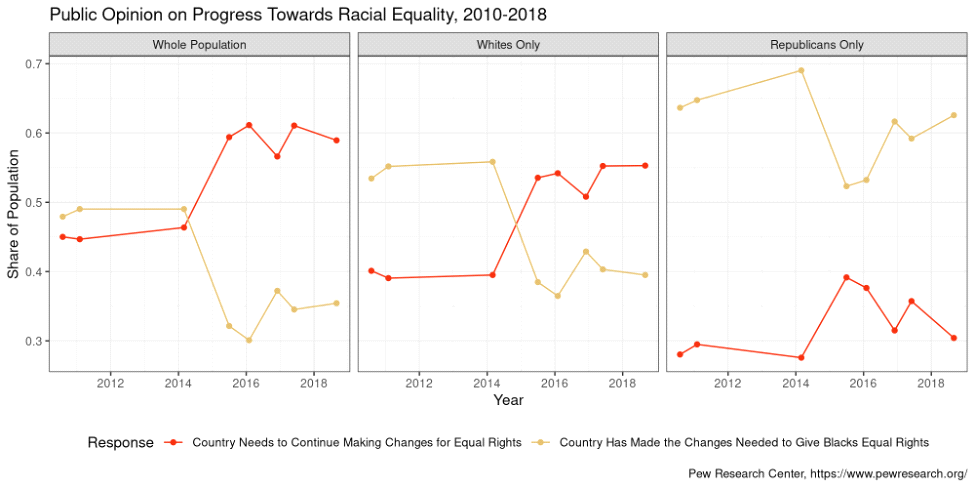 Mas há poucas evidências para esse argumento. De fato, os dados de opinião pública sugerem fortemente que esses episódios contribuíram para idéias mais progressistas em questões raciais. Na última década, o Centro de Pesquisas Pew vem perguntando às pessoas se o país fez o suficiente para garantir a igualdade entre brancos e negros ou se precisa fazer mais. Uma olhada em seus resultados torna óbvio o impacto do BLM.