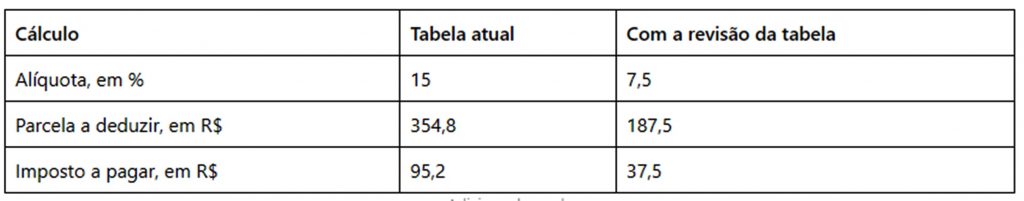 O alívio seria imediato com a redução dos descontos, em razão do aumento no nível de isenções e das demais faixas da tabela. Em termos de declaração, apareceria apenas em 2023. Além disso, é uma obrigação de Bolsonaro promover o reajuste da tabela.
